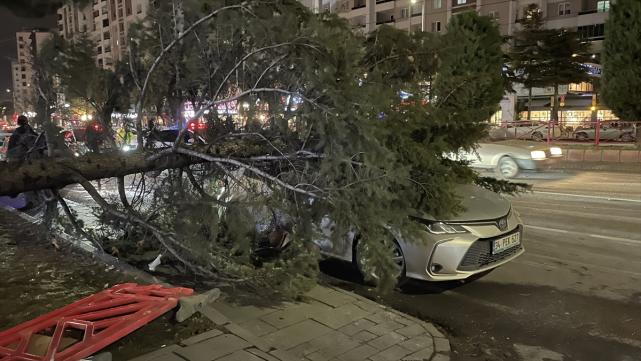 Çam ağacı, yol kenarındaki 34 PEK 527 plakalı otomobilin üzerine devrildi.