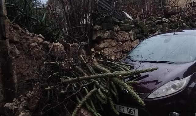 Mersin'de şiddetli yağışta evin duvarı otomobilin üzerine devrildi