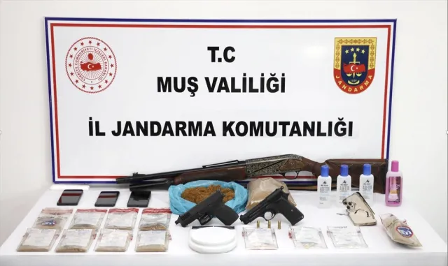 Muş Haberleri — Muş'ta jandarma ekiplerince düzenlenen uyuşturucu operasyonunda gözaltına alınan 5 şüpheliden 2'si tutuklandı.Valilikten yapılan açıklamaya göre, İl Jandarma Komutanlığı ekipleri, uyuşturucu imal ve ticareti yapanların yakalanmasına yönelik çalışma yürüttü.Bu kapsamda, düzenlenen eş zamanlı operasyonda, 5 şüpheli gözaltına alındı.Şüphelilerin adreslerinde, 860 gram sentetik uyuşturucu, 9 parça satışa hazır sentetik kannabinoid, 10 gram sentetik kannabinoid ham maddesi, 3 uyuşturucu hap, 1 gram kokain, hassas terazi, 2 ruhsatsız tabanca, 2 tabanca şarjörü ve ruhsatsız av tüfeği ele geçirildi.İşlemlerin ardından adliyeye sevk edilen şüphelilerden 2'si çıkarıldıkları hakimlikçe tutuklandı, 3'ü adli kontrol şartıyla serbest bırakıldı.