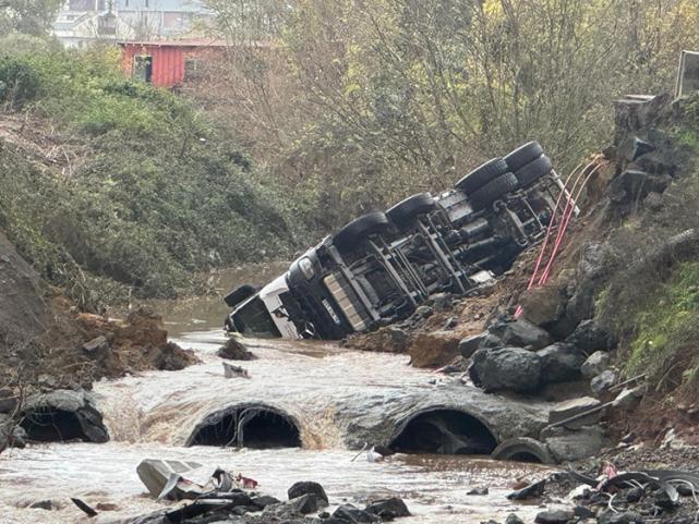 Uskumruköy'de, viyadüğün altındaki inşaat alanında derenin üzerinden geçen yolda yağışın etkisiyle çökme meydana geldi.Çökmenin ardından yoldaki pikap ile kamyonet dereye düştü. Pikabın suyun etkisiyle yaklaşık 200 metre sürüklendiği öğrenildi.İhbar üzerine olay yerine jandarma, sağlık, itfaiye ve arama-kurtarma ekipleri sevk edildi.Ayrıca bölgede sele kapılan bir araç da kanala düştü, bazı iş yerlerini su bastı.Ekiplerin çalışmalarını sürdürdüğü bölge dronla görüntülendi. Dereye düşen kamyonet de vinçle çıkarıldı.Görgü şahidi Ömer Aslan, AA muhabirine, saat 05.00 civarında şiddetli sağanak başladığını anlattı.Yağışın etkisiyle köprünün çöktüğünü kaydeden Aslan, bir ticari araç ve kamyonetin köprüden dereye uçtuğunu, bir restoranı su bastığını belirtti.Aslan, diğer iş yerlerinde hasar oluşmadığını sözlerine ekledi.- Suda kalan araçlar kameradaSel nedeniyle iki aracın suda sürüklenmesi çevredeki bir güvenlik kamerasınca kaydedildi.Görüntülerde, suda sürüklenen bir aracın durması ve içerisindeki kişilerin inmesi yer aldı.Kayıtlarda, suyun etkisiyle hareket edemeyen 2 aracın da sürücülerinin inmesinin ardından bölgede kaldığı görülüyor.